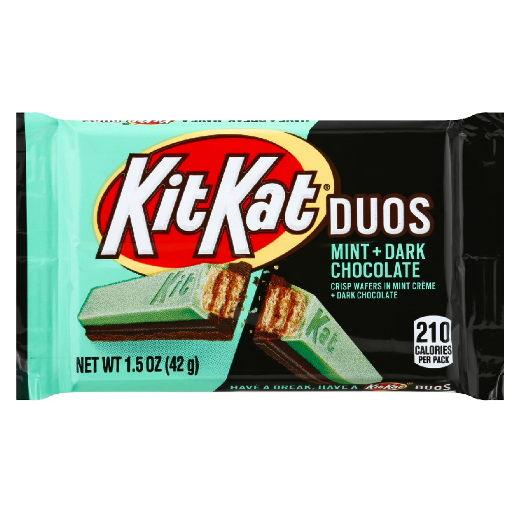 Οι άνθρωποι που τους αρέσει η σοκολάτα μέντας είναι οι πιο cool. Για ένα εξίσου δροσερό διάλειμμα, δοκιμάστε τις μπάρες καραμελών με μέντα και μαύρη σοκολάτα KIT KAT DUOS. Αυτές οι τραγανές γκοφρέτες βυθίζονται σε μισή μαύρη σοκολάτα και μισή κρέμα μέντας για μια εξαιρετικά νόστιμη ανανέωση στις κλασικές μπάρες KIT KAT.