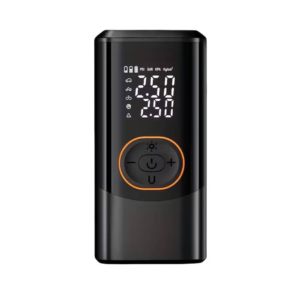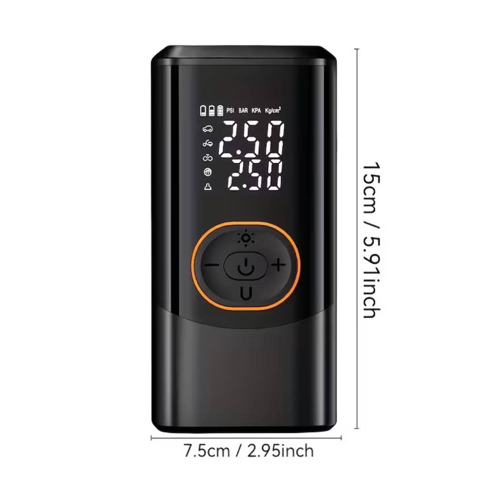 Αυτός ο φορητός, ασύρματος αεροσυμπιεστής είναι ιδανικός για αυτοκίνητα, μοτοσυκλέτες και ποδήλατα. Με ψηφιακό μετρητή πίεσης, μέγιστη πίεση 150 PSI, επαναφορτιζόμενη μπαταρία και LED φως, προσφέρει άνεση και ασφάλεια σε κάθε φούσκωμα. Compact (15 × 7,5 cm) και εύκολος στη μεταφορά, είναι το απόλυτο εργαλείο για κάθε όχημα ή ποδηλάτη.