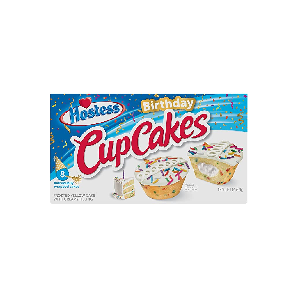 Υπάρχει λόγος να γιορτάζετε κάθε μέρα με Hostess Birthday CupCakes. Αυτές οι λιχουδιές κίτρινου κέικ είναι γεμάτες με διασκεδαστικές κηλίδες στο χρώμα του ουράνιου τόξου για να ανεβάσουν τη διάθεσή σας.