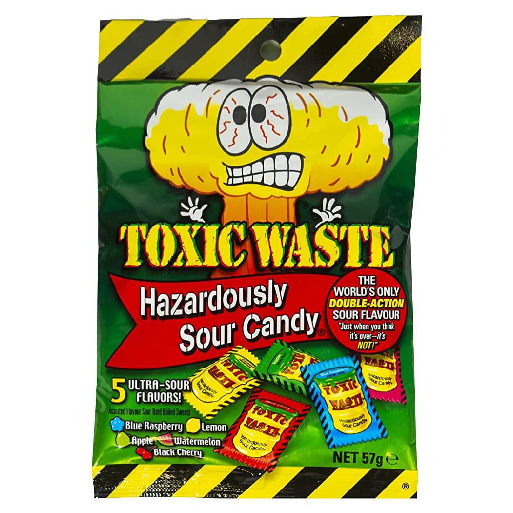 Toxic Waste Hazardously Sour Candy Δοκιμάστε τις μοναδικά όξινες καραμέλες με ξεχωριστή συσκευασία, με γεύση φρούτων που είναι αρκετά ισχυρές ώστε να χαρακτηρίζονται επικίνδυνες! Απολαύστε τις επιπλέον ξινές καραμέλες και ανακαλύψτε πώς ξεδιπλώνονται αργά τα φρουτώδη αρώματα μήλου, καρπουζιού, σκούρου κερασιού, βατόμουρου Όρεγκον και λεμονιού –